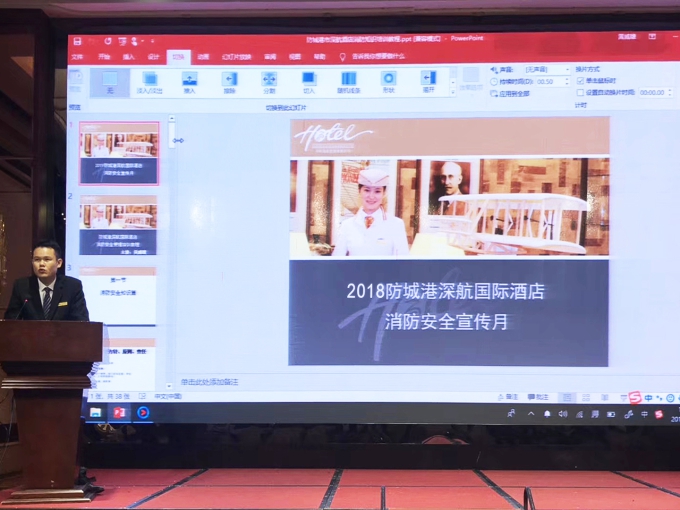 为进一步加强全体员工消防安全意识,全力普及消防安全知识,推进消防安全宣传工作,11月05日下午,在酒店领导和业主方的大力支持下,防城港深航国际酒店对全体在职员工开展了安全消防知识培训会。