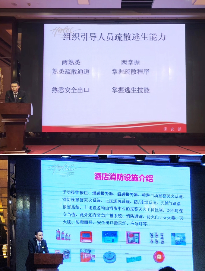 培训会上,酒店保安部经理黄威雄先生主要以:消防安全基础知识、消防设施设备名称及功能介绍、灭火、报警、逃生注意事项等方面为大家一一讲解在酒店内如何防范和应对火灾事故的发生。着重强调“四个能力”执行措施,要求酒店全体人员切实加强消防安全知识,做好消防安全隐患排查,杜绝火灾事故。