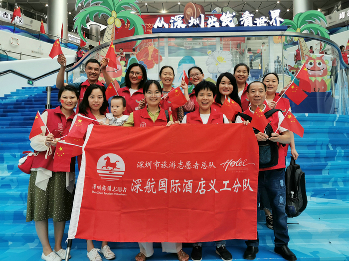 9月28日下午,作为深圳酒店行业的第一支义工队伍——深圳深航国际酒店义工队代表一行前往蛇口邮轮中心大厅,与旅游行业近400人共同参与见证了“文明旅游为中国加分——出行有礼”之“把文明旅游”系列活动,并参与了为祖国70周年华诞献礼的快闪活动拍摄。义工代表程方荣感慨:有幸参与祖国70周年历史性时刻的活动,难掩感动、兴奋之情,借此再次祝福祖国生日快乐、繁荣昌盛!