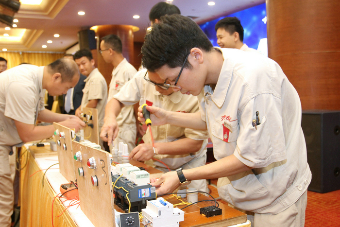 工程部赛项种类多样, 各项赛事的选手们为了展示必胜的信心, 还喊出了带有自身比赛特点的响亮口号 : “星三角启动”口号---超越自我、挑战无限,“油漆调色”口号---漆彩世界、有我真彩,“风机盘管接线”口号---扬帆起航、谁与争锋。
