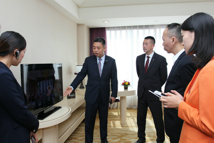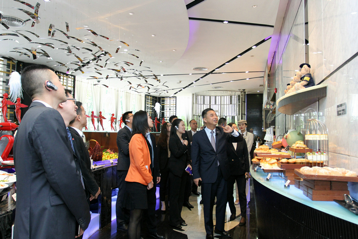 当天上午,肖强副总经理带领深圳桔钓沙莱华度假酒店的管理团队一行参观了酒店,从1楼大堂至顶层30楼总共历时1个多小时,通过前后台现场讲解使来宾们更加真切地感受到深圳深航国际酒店别具一格的航空文化主题、差异化的服务创新细节以及网络信息技术的大胆探索与应用。