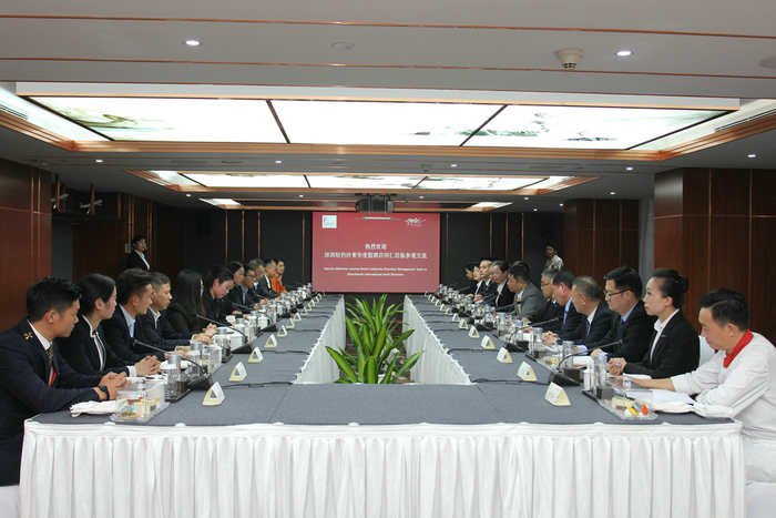 2019年12月18日,深圳桔钓沙莱华度假酒店总经理肖万新先生率领管理团队共14人抵达深圳深航国际酒店并进行参观交流,深圳深航国际酒店常务副总经理魏文斌携酒店管理团队热情地接待了深圳桔钓沙莱华度假酒店一行的领导和同仁。