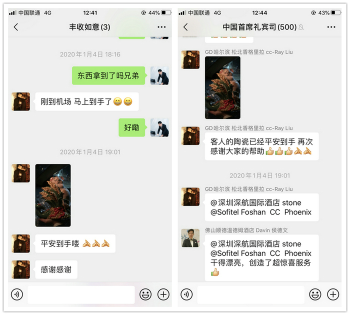 与此同时,另一个更为艰巨的任务摆在了大家面前:如何把陶瓷制品“丰收如意”及时地从位于南方的广东佛山运到三千多公里之外的东北哈尔滨?此时已经是1月3日下午,各地金钥匙纷纷出谋划策,但却没有一个相对保险的万全之策,正当哈香金钥匙刘春雷毫无头绪时,深圳深航国际酒店金钥匙梁自超主动联系上了他,并表示深圳航空新近推出的超快送“当日达”业务能在全国范围内6小时直达, 应该可以助一臂之力。正巧1月4日就有深航航班飞往哈尔滨, 他会协助联系深航货运将陶瓷按时运到哈尔滨。