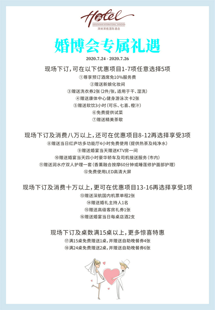 若需了解更多婚宴优惠详情,敬请致电深圳深航国际酒店市场营销部(86 755) 88819999转6811。