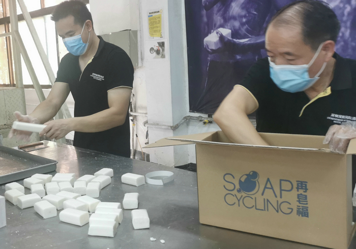 从深圳深航国际酒店收集回来的肥皂,前后经历了去污、粉碎、搅拌、成型、切块、装箱共6个步骤,最终见证它们变成一块块崭新的“再皂”。深圳深航国际酒店,一直践行公益,从未止步!在本次志愿者活动中,共收获了80公斤“再皂”,这足够160位小朋友使用一整年。