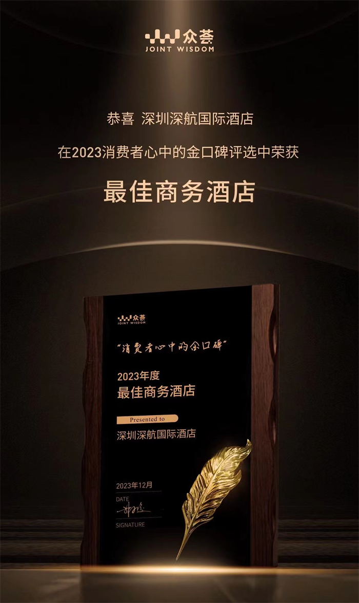 同时,众荟“2023消费者心中的金口碑”评选近日正式公布了获奖信息,深圳深航国际酒店荣膺“最佳商务酒店”。 据了解,众荟是国内酒店行业先进的全数据平台,专注于酒店领域数据科技和人工智能技术创新,其独创的“客户观点数据库”,在业内有着很高的威望,而赢得金口碑奖项再一次印证了深圳深航国际酒店是以深情无限、自然体贴的服务著称的民族品牌。