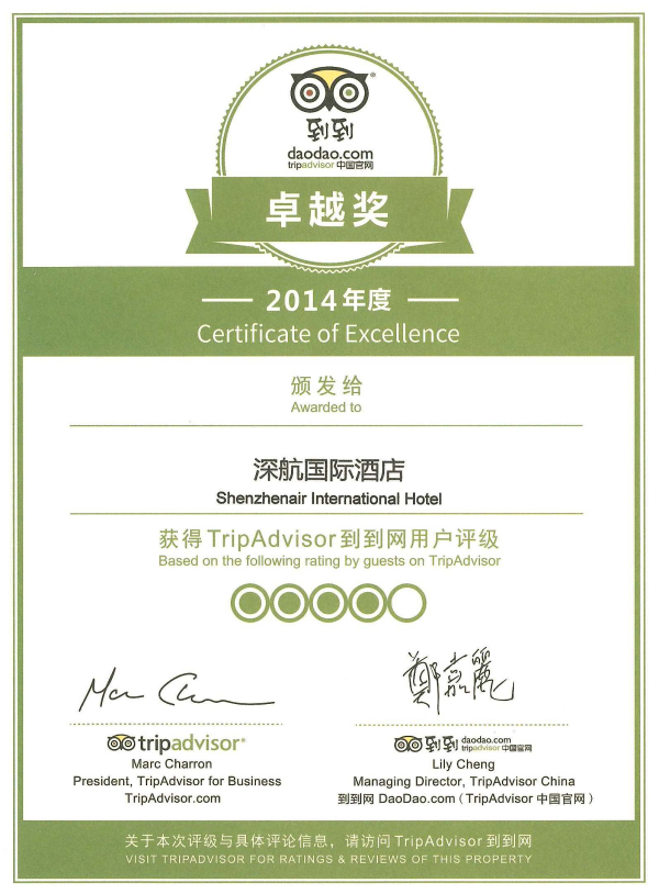 深圳深航国际酒店荣膺全球最大旅游点评网2014年度“卓越奖”