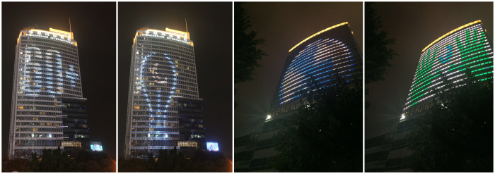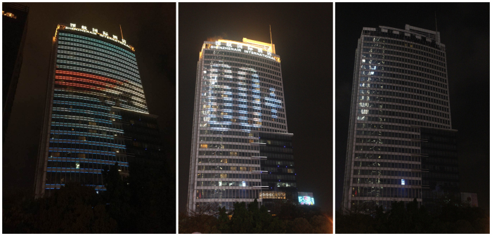 外墙楼体熄灯前及熄灯后对比鲜明(日常灯光/熄灯前/熄灯后)