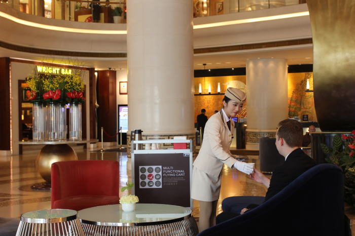 每一天,我们会穿梭于酒店大堂,关注着来往的客人。这一天,我在大堂,因为连日以来入住率超高,此时适逢办理入住高峰期,眼见一位排队等候办理入住手续的客人已经很累也显得有点不耐烦了,为了安抚客人,我赶紧主动上前陪客人聊天,也向他表示了歉意,客人表示理解,也表示酒店很人性化,会主动关注客人的需求。而每一天,在这7个时段:08:30 / 10:50 / 13:50 / 16:20 / 18:00 / 20:00 / 22:00 ,我们会推着“多功能服务车”,为等候的宾客递上冷热毛巾和饮品等等,目前“多功能服务”配备有中英文报纸、杂志、冷热毛巾、饮品等。