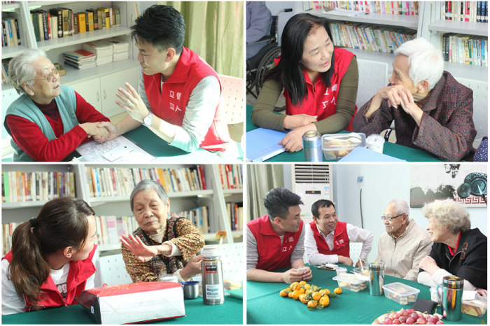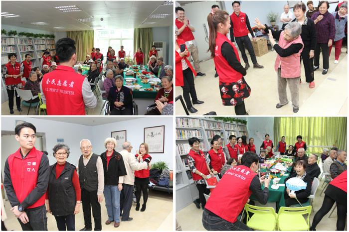 在酒店义工队的组织下,现场还玩起了你演我猜的游戏环节,爷爷奶奶们露出了开心的微笑,个个精神抖擞,完全看不出来有90多岁上午高龄。 最精彩的一幕来自最后一轮, 由酒店实习生谢波秀与老人们进行精彩互动,将现场的气氛推向了高潮;另一个温情的环节是志愿者们与老人们纷纷拿起印有“用微笑拥抱每一天”口号的纸模道具进行合影拍照, 志愿者们的热情深深地感染了老人们,老人们分享的人生故事也深深地吸引了酒店的义工,不知不觉地时间便飞逝而过, 老人们对酒店的义工们依依不舍,拉着我们的手一起动情地唱起了他们最喜欢的怀旧歌曲——《南泥湾》与《蜗牛与黄鹂鸟》, 同事们和老人们一同度过了一个愉快而难忘的感恩节。