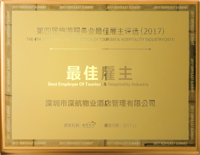 由最佳东方主办的“2017最佳东方高峰论坛暨旅游服务业最佳雇主颁奖盛典”于2017年11月3日在杭州圆满闭幕。深航酒店管理公司喜获“2017旅游服务业最佳雇主”奖项。