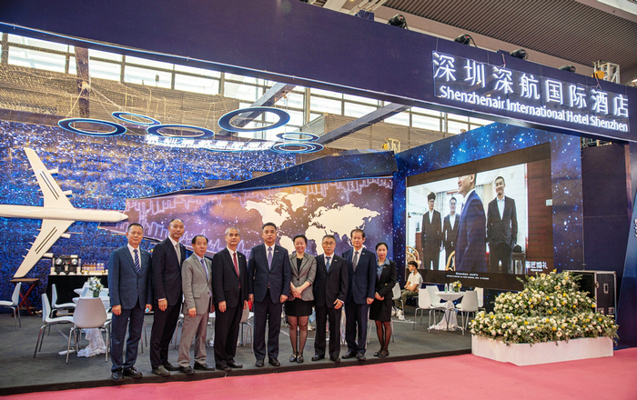 本次展会的面积约30000㎡,汇聚了婚纱摄影、婚礼策划、婚纱礼服、珠宝首饰、婚宴酒店、婚礼用品等领军品牌。深圳深航国际酒店展位将航空文化的主题,通过科技风加以渲染,更显大气非凡。 展位背景上气势恢宏的大型定制机模和繁星点点的世界航线地图吸引了众多观展人士与新人驻足欣赏及拍照分享,极具吸睛效果。