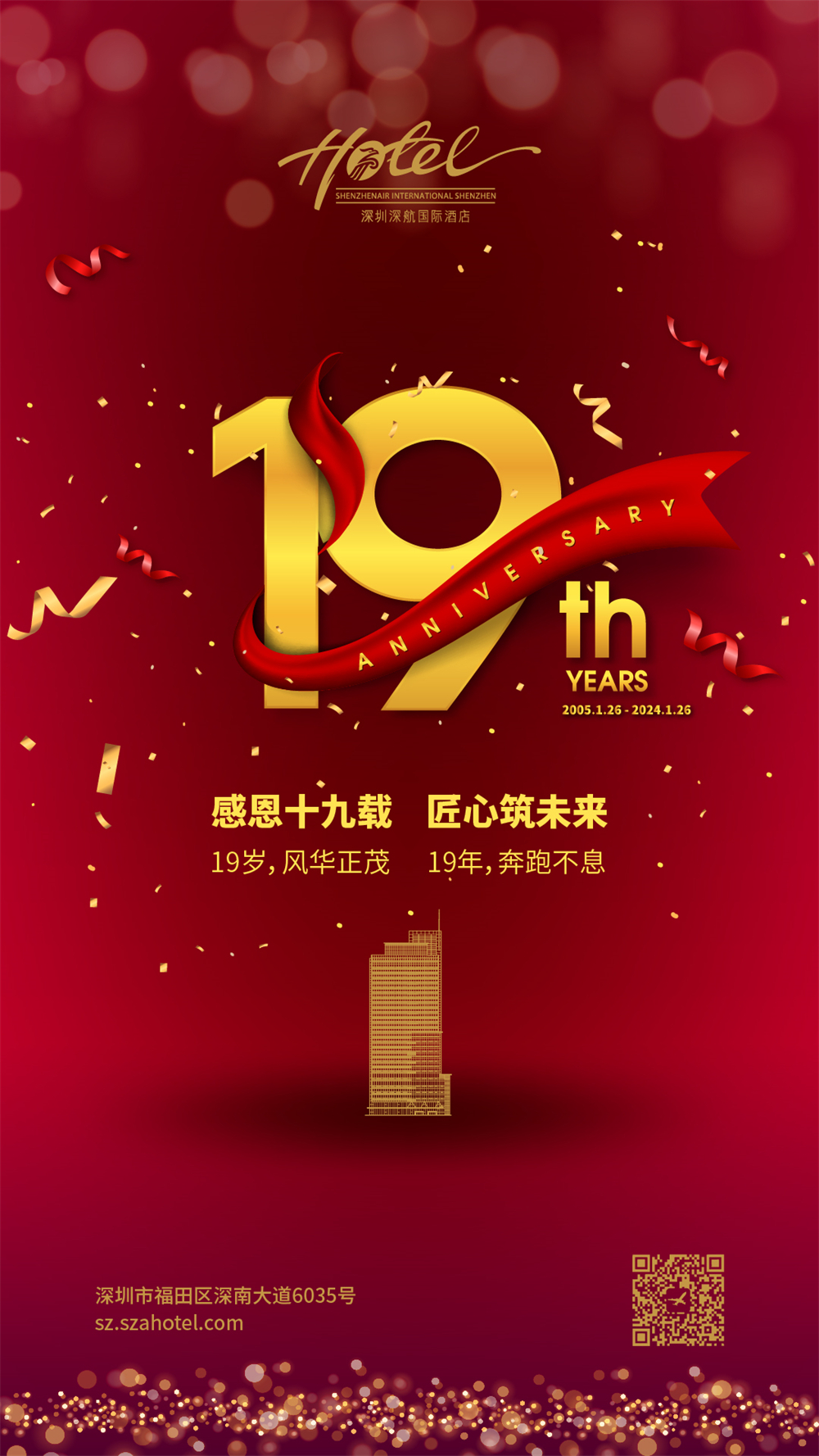 时光荏苒,十九年的岁月见证了深圳深航国际酒店“走航空特色之路、创民族酒店品牌”的历程,店庆日的到来既是我们回顾共同奋斗的难忘时刻,也是酒店凝心聚力、再创辉煌的最佳起点。展望未来,酒店将继续秉持深航“为美好生活添翼”的宗旨,不断优化管理、提升服务,为宾客创造更多美好的入住体验,同时期待与各界朋友携手并进,共创更加美好的未来。