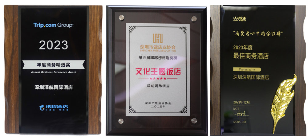 为宾客提供超越期望的体验,始终是深航酒店人不懈追求的目标。在全面复业后的一年时间里,通过经营管理团队的共同努力和示范引领下,干职员工的技能水平及服务态度不断得以提升,深圳深航国际酒店稳步迈入了一个全新的阶段。2023年荣膺携程“年度商务酒店精选奖”并重新荣登“深圳豪华酒店榜单”;通过众荟平台消费者大数据评选为“年度最佳商务酒店”并在竞争群的24家高端酒店中排名一度达到第二; 荣获深圳市饭店业协会第五届琅琊榜“文化主题饭店”;成功入围抖音“深圳市豪华酒店人气榜”并实现餐饮、客房多项产品销量翻倍增长。