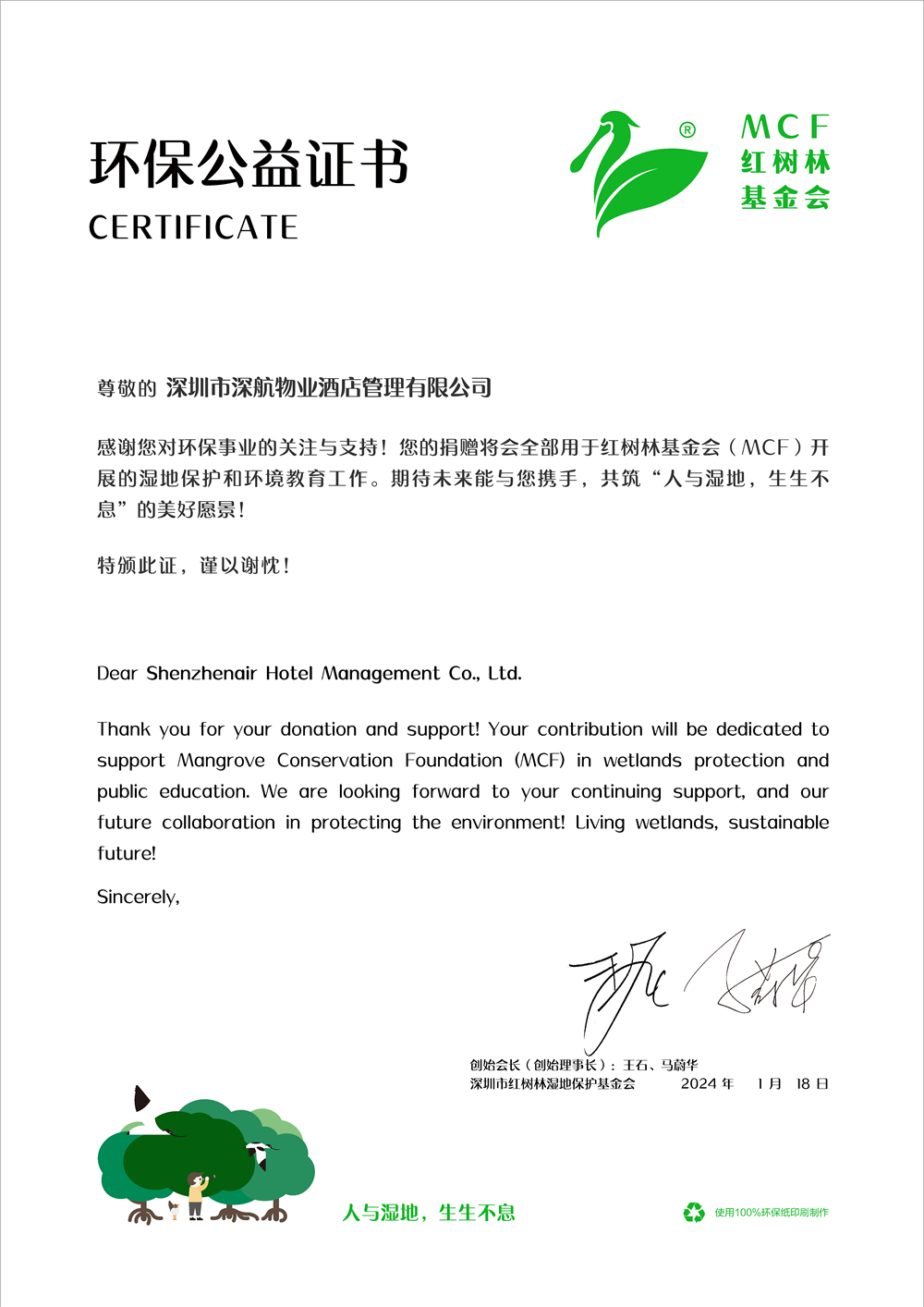 深圳深航国际酒店始终坚持“绿色十诺”的理念,通过一系列环保公益活动回馈社区。在全面复业的一年里,深圳深航国际酒店携手参与红树林基金会“守护深圳湾”环保活动、积极参与地球一小时环保活动等,为社会贡献一份力量。传递温暖,展现深航国际酒店的企业担当。