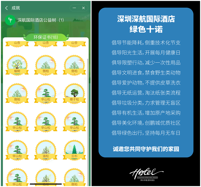 与此同时,自2020年3月开始,深航酒店管理公司全体干职员工自愿参与了蚂蚁森林线上公益植树活动,在员工的积极参与下,4年内已成功种下了18株公益树,并分别被中国绿化基金会、中国绿色碳汇基金会、中华环境保护基金会等分别认领,并悉数种植于陕西省延安、河北省邯郸、云南省大理、宁夏中卫等地区。自这“一小时”开始,延续并释放“一小时”之力。蚂蚁森林公益植树项目依然会长期进行,让我们一起携手,共同助力绿色公益!并借此契机再次呼吁员工们在一小时稍“熄”片刻为地球减负的活动后,持续开启健康生活方式,通过衣、食、住、行、乐五个方面做起,绿色出行、垃圾分类、光盘行动等方式,用点滴努力共创绿色未来。