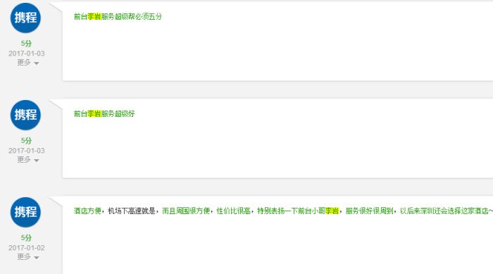 在刚刚过去的2016,是充实忙碌而又快乐的一年!2015年5月28日,我入职深圳深航国际酒店礼宾部,机缘巧合下,2016年转职到客务部,回首来时的路,在这9个月里,在部门领导及同事们帮助下,从对于酒店前台接待工作一无所知到现在能够独立当班,从不敢主动开口到现在能够与客人对答如流并提供优质服务,我很庆幸做到了,并一直坚守岗位,细致认真地服务好每一位客人。踏实工作,勤勤恳恳,一月份得到了这么多客人的满分点评,是对我最好的鼓励,也是对我工作最大的认可!