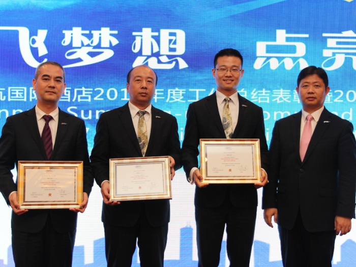深圳深航国际酒店副总经理肖强先生(右一)向“年度优秀员工”颁发奖状
