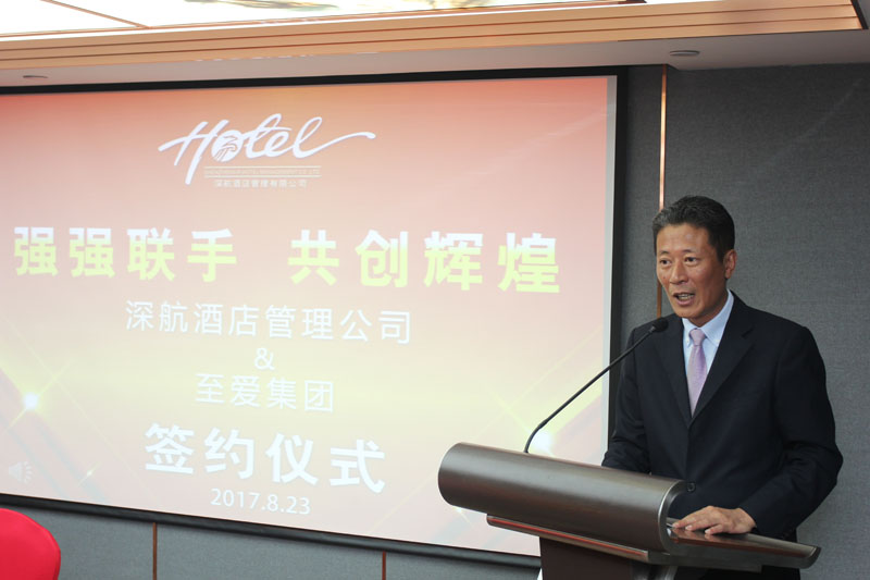 2017年8月23日, ?詈骄频旯芾砉居肷钲谥涟啪蜕钲谥涟占涔示频辏唇诿?ldquo;至爱深航鹏雅酒店”)签订全权委托管理合同, 双方将在互联网酒店新零售领域展开深度合作,并借助深航酒店管理公司的专业化管理服务, 为下榻宾客打造全新生活方式——新零售酒店(移动互联网技术与实体消费场景体验相结合的新型电商业态酒店) 。 当天, 深航酒店管理公司总经理黄俭先生、副总经理肖强先生、郭广军先生以及至爱集团董事长侯波先生、联合创始人苏星女士、股东黄丹女士和陈森先生、集团总裁张晓明女士以及特邀嘉宾深圳市饭店业协会创始会长易新南先生一同出席了本次签约仪式。